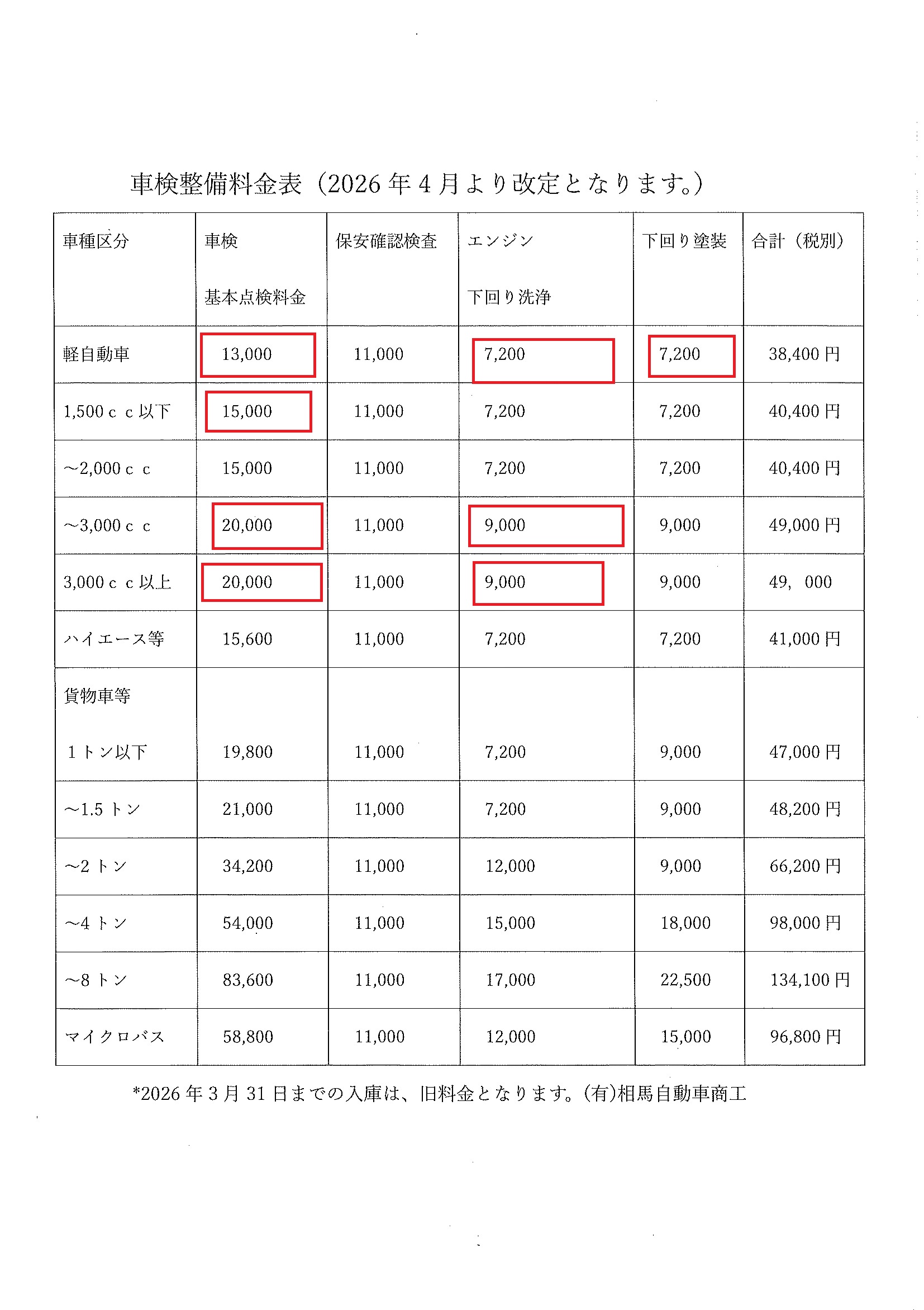 2026年4月1日より以下の通り車検整備料金を改定させていただきます。